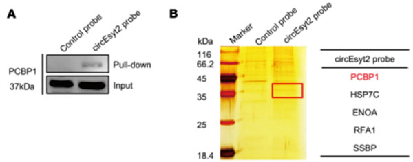 CircEsyt2 inhibits the nuclear trafficking of PCBP1 by binding directly to PCBP1. (A) Western blotting of proteins pulled down by control and circEsyt2 probes in circEsyt2-OE HEK293T cells using the PCBP1 antibody. (B) Identification of circEsyt2-binding proteins. Left: silver staining of pulled-down proteins in circEsyt2-OE HEK293T cells. Right: mass spectrometry showing the main proteins pulled down by the circEsyt2 probe.